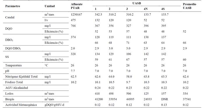 El caudal medio de tratamiento osciló entre 400 y 500 l/s y se identificaron caudales de trabajo de cada reactor UASB entre 120 a 130 l/s. El rango mesofílico de temperatura de la zona en donde se localizó la planta y de todas las etapas del sistema de tratamiento estuvo entre 22 y 31 °C, que junto al pH (extremos entre 6.0 y 8.0) permitieron condiciones de estabilidad para las bacterias metanogénicas y un ambiente reductor favorable para los procesos anaerobios [13,17].