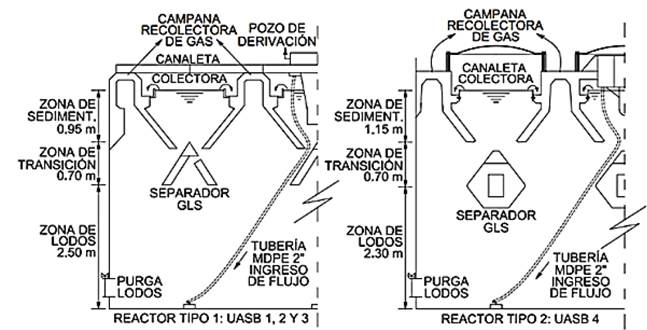 Figura 2: Sección típica de los reactores UASB tipo 1 y tipo 2.