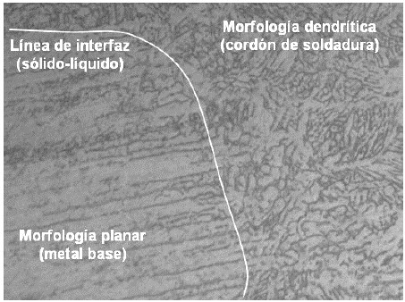 En la Fig. 9, (10 ppm de oxigeno atmosférico durante la soldadura) se observa algo similar a la microestructura a 200 ppm, en la interfaz de solidificación se observa la presencia de cristales sólidos de tipo dendrítico en la zona epitaxial del cordón de soldadura y una estructura granular del tipo planar en el metal base.