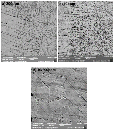 Para complementar el estudio se realizó un estudio morfológico con el microscopio electrónico de barrido (SEM), las observaciones se realizaron en alto vacío obteniendo imágenes con el detector de electrones retro-dispersos. Las imágenes SEM (Fig. 10) revelan con mayor detalle la formación del cordón de soldadura y el metal base comparables con reportes previos [14], evidenciando la formación de cristales sólidos del tipo dendrítico en la zona epitaxial del cordón de soldadura y una morfología planar en el metal base similares para ambas muestras caracterizada 200 ppm (Fig. 10a) y 10 ppm (Fig. 10b). La Fig. 10c, muestra el metal base AISI 304, que tiene un crecimiento de granos de forma equiaxial.
