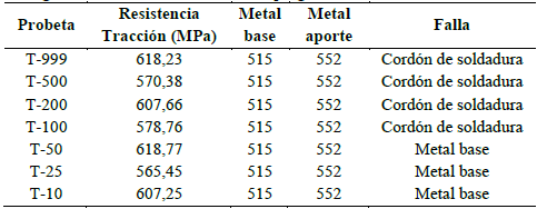 La Fig. 5, muestra las probetas ensayadas en la máquina Tinius Olsen modelo Super L120, todas llevadas hasta la fractura. Se conoce que la resistencia a la tracción del metal base (AISI 304) es de 515 MPa (75 ksi) [19] y según el catálogo de consumibles AGA la resistencia a la tracción del metal de aporte (ER 308L) es de 552 MPa (80 ksi) [20].