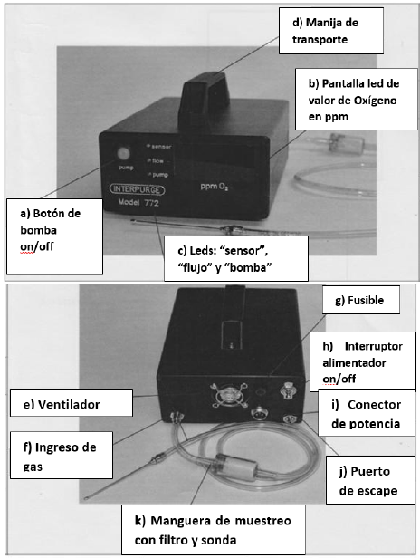 Figura 2: Medidor de oxígeno residual INTERPURGE Modelo 772. Vista frontal y posterior con los nombres de sus principales componentes.