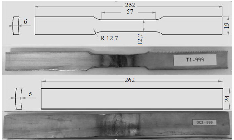 Figura 3: Geometría para los ensayos de tracción con la fotografía de la probeta (superior), y geometría para ensayo de doblado con la fotografía de la probeta (inferior).