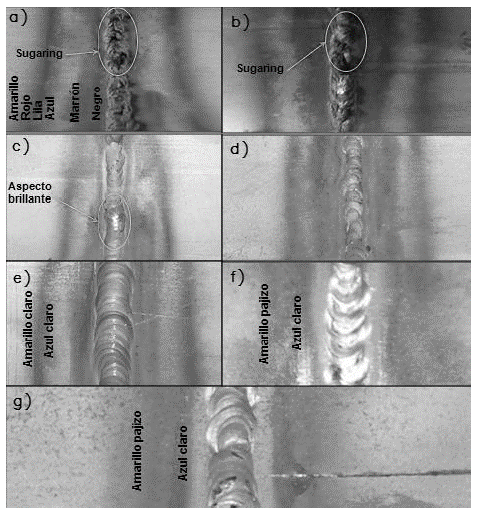 Figura 4: Niveles de decoloración y presencia de imperfecciones de soldadura en la ZAC, según el contenido de oxígeno atmosférico en la cámara de purga. a)999 ppm, b)500 ppm, c)200 ppm, d)100 ppm, e)50 ppm, f)25 ppm, g)10 ppm.