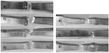Se atribuye la fractura de las probetas en el cordón de soldadura (Figs. 5 a-5d), debido a que durante el proceso de soldadura existen variables como: la falta de penetración, estabilidad del arco o concentración de temperatura en la ZAC, por el contenido de oxígeno atmosférico presente en la cámara, que impide que el argón actúe en la zona de fusión. Se observar que en las probetas 5e, 5f y 5g la rotura se produjo en el metal base, evidenciando que la soldadura resiste.