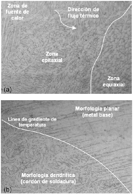 Las Figs. 9, 10 son muestras de soldadura observadas en el microscopio óptico para analizar la microestructura formada. En la Fig. 8a, (200 ppm de oxigeno atmosférico durante la soldadura), se evidencia dos zonas: la zona equiaxial que corresponde a los granos cuyo crecimiento ha sido igual en todas las direcciones y la zona epitaxial presenta una morfología de cristales sólidos del tipo dendrítico que tienen la forma parecida a un árbol, el tallo principal se llama brazo primario dendrítico y las ramas ortogonales se llaman brazos secundarios dendríticos. La Fig. 8b evidencia la estructura del metal base de tipo planar, y como se solidifica el cordón de soldadura de acuerdo con un gradiente de temperatura.