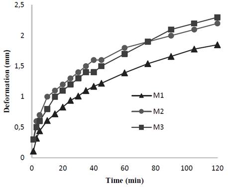 The total deformations were measured in minutes 1, 3 and 5, timing from the beginning of the test. Subsequently, the deformations were measured every 5 minutes until completing 45 minutes, and from this moment, measurements were taken every 15 minutes until the end of the test at 120 minutes. From the deformations obtained at the aforementioned times, the average deformation velocity, corresponding to the time intervals, was calculated by means of equation (3).