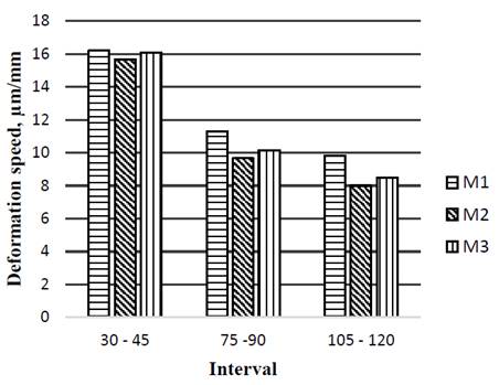 The deformation speed was calculated for the intervals between 30 - 45 minutes, 75 - 90 minutes, and 105 - 120 minutes for each of the mixtures. The results are shown in Fig. 6.