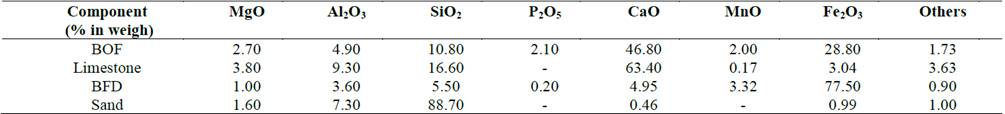 Table 3: Chemical components of BOF, limestone, BFD and sand