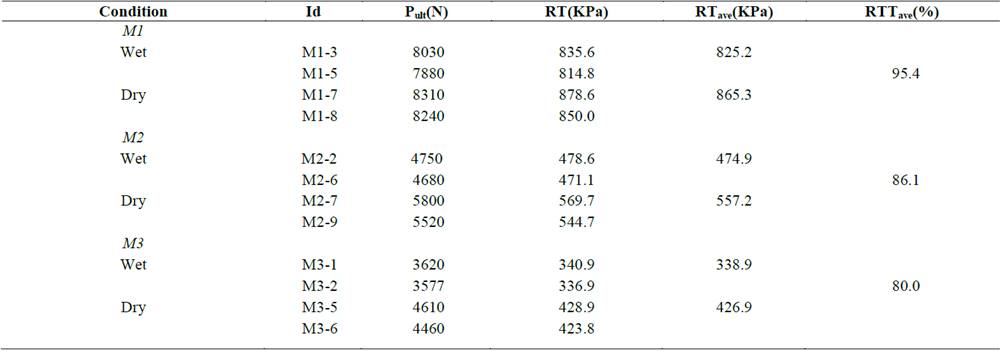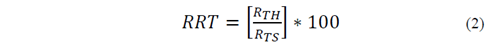 The tensile strength ratio (RRT) was calculated as the ratio of the average resistance to the tension of the water conditioned subgroup (RTH) and the average resistance to the tension of the subgroup maintained in dry (RTS), as expressed in equation (2).