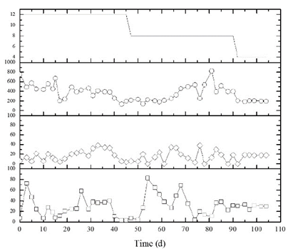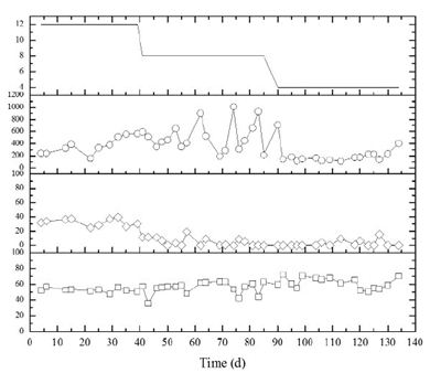 The reactors operated with a constant flow for 134 and 104 days, respectively. The operation time for R1 was 12 h for 39 days and the second stage with an 8h for 48 days; and the third stage with a 4 h for 45 days. On the other hand, the R2 reactor was operated with a 12 h, 8 h and 4 h HRT for 45, 40 and 12 days, respectively. The reactors were placed in a thermocontolled chamber at a constant temperature of 35 ºC