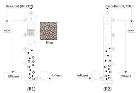 Despite the already known advantages of UASB reactors, the practical application of these systems for producing hydrogen is still limited, mainly due to long initial times, the type of inoculum capable of minimising the biomass drag, proper handling of hydraulic detention times, etc. [8] mentioned that, by placing supporting structures at the suspension, the process could be accelerated; this is known as hybrid UASB. [9] used a hybrid UASB reactor to treat wastewaters with phenolic compounds. The reactor consisted of an acrylic cylinder at a bench scale in which approximately 54 rings were placed in a 30.48 cm in the middle of the reactor. Hence, a larger biomass concentration would be retained at shorter hydraulic retention time. The results showed that the anaerobic hybrid reactor tolerates 2.5 times more the phenolic organic load increase than the conventional UASB reactor. [10] also demonstrated that having an area with a filtering medium in suspended biomass anaerobic reactors improves the contact between the substrate and the sludge, minimizing the sludge loss and reducing the hydraulic retention time.