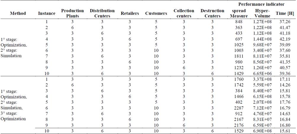 Results of the developed experimental studies are tested on 48 randomly generated instances, changing the number of nodes in each of the six levels of the supply chain, with three or six nodes per level and five or ten customers, which correspond to 24 different configurations. All the experiment are carried out in a computer with an Intel(R) Core(TM) i7-3930k CPU @ 3.20 GHz. Processor. 12 GB RAM. Operative system: 64-bit Windows 8. The mathematical models are solved using GAMS and CPLEX, and the simulation engine is developed in VBA.