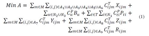 𝑋 𝑖𝑗𝑚 : Amount of product to transport in the arc (𝑖,𝑗)∈ 𝐴 1 ∪ 𝐴 2 ∪ 𝐴 3 ∪ 𝐴 4 ∪ 𝐴 5 ∪ 𝐴 6 by transportation mode 𝑚∈𝑀.