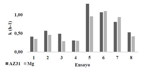 Figura 10: Cinética de electrodisolución, valores de k aparente.