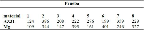 Por otra parte, las densidades de corriente fueron seleccionadas a través de una polarización potenciostática realizada para AZ31 en una solución de 1022 mg/L de NaCl, donde se evidenció que para densidades de corriente mayores a 50 A/m2, el voltaje del electrodo de trabajo se incrementa en 0.6V vs Ag/AgCl (datos nos mostrados).