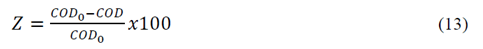 Donde U es el voltaje de celda (V); I densidad de corriente (A); t tiempo (s); n número de electrones involucrados en la reacción; F constante de Faraday (C/mol); M peso molecular (g/mol); UED unidad de demanda de energía (kWh/kg de COD removido); V volumen de solución tratada (m3); Yt disminución de COD (%); UEM unidad de demanda del material del electrodo (kg/kg COD removido); EOC costo operacional (USD$/kg COD removido); EEP precio de la energía eléctrica (USD$/kW-h), considerado como 0.315 USD$/kW-h; EMP costo del material del electrodo (USD$/kg) estimado de proveedores internacionales como 2.42 USD$/kg para el magnesio de alta pureza y 25 USD$/kg para el AZ31.