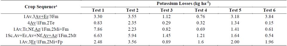 Table 5: Potassium loss for crop sequences in six water erosion tests with simulated rainfall in southern Brazil.