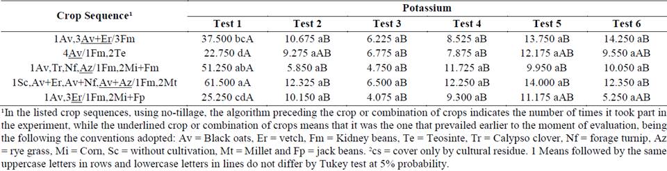 The highest potassium losses in the soil were in the Test 1 for the crop sequences. In this test, the results were obtained for 1Av,Tr,Nf,Az/1Fm,2Mi+Fm and 1Sc,Av+Er,Av+Nf,Av+Az/1Fm,2Mt, which reached on average 7.0 kg ha-1. This loss of K may be associated with a higher mobility of this ion in the soil, although the soil has 100% coverage. In the other evaluations, a loss pattern of this element was not observed (Table 5). This lack of pattern is linked to a starting time of the runoff that varied in both shape and magnitude [20]. Potassium lost in runoff was not influenced by the different crop sequences planted in the research and, for all of them, did not differ statistically (Table 6). Similar tendencies were observed by [21] in different plant cover conditions, where potassium losses were influenced by the magnitude of rainfall events. Potassium was easily lost in the soil condition without mobilization and with 100% coverage (Test 1). This is due to the soil class under study (typical Dystrophic Red Argisol) because it presents a low colloidal activity and a low affinity with ions, being easily released in runoff water (floodwater), which can be attributed to the low affinity of K with soil constituents.