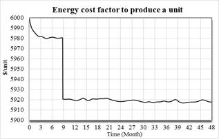 Another interesting aspect was related to energy consumption. While measures are not implemented in the technology energy saving factor (equal to 0), this will accumulate over time in direct proportion to the levels of production and inversely to the levels of efficiency and productivity. When a technology energy saving factor equal to 0.3 was established, it was observed that the slope changes to a lower value after period 12. With a technology saving factor of 0.5, the value of the slope decreased from period 9 onwards. Regarding the cost of energy per unit of production, it remained constant when the technology energy saving factor is zero. When the savings were 0.3 and 0.5, the energy costs per unit of manufactured product decreased by $1,600 and $3,000, respectively, from period 9.