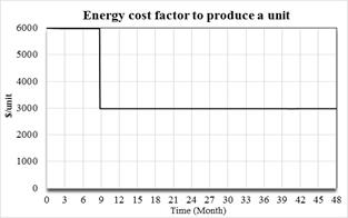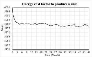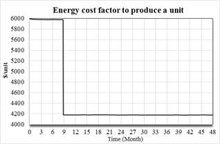 When evaluating the energy cost factor of producing a unit in front of the variations that occur in the technology energy saving factor, rational changes are visualized in Figs. 13, 14, 15 and 16. In the first case (Fig. 13), When the technology energy saving factor is zero, the energy cost factor of producing a unit decreases a little at the beginning ($20); later, from period 3 it maintains a marginal decreasing trend with minimal variations. In the second case, when this factor is 0.01 (Fig. 14), similar to the previous case (Fig. 13), the energy cost factor of producing a unit decreases a little at the beginning ($20) and then after period 9 an additional decrease is observed, of $80 per unit regarding its energy cost. When the savings are 0.3 (Fig. 15) and 0.5 (Fig. 16), the energy costs of per unit of manufactured product from period 9 decrease by $1,800 and $3,000, respectively.