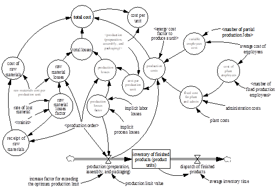 The production (preparation, assembly and packaging) is impacted by production or material losses, and by the levels of equipment operation capacity or worker productivity, this in turn is reflected in defective material parts or units. The manufactured products go to the inventory of finished products. There is a maximum storage capacity, a maximum time of permanence, and a dispatch volume of products which determines the dynamics of said inventory.