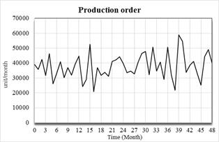 Based on the records of monthly production, it was found that the production orders were adjusted to a normal distribution with an average and deviation of approximately 39,000 and 8400 units respectively, with minimum reference values of 20,000 and a maximum of 65,000. With reference to the above information, the orders were generated randomly (Fig. 6) following a normal distribution. It was observed that the minimum value generated is 20,868 and the maximum value 58,913. To this end, a process of orders was simulated, coherent with a realsitic context of a company woth a 48- onth outlook.