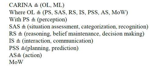 In CARINA, object-level has stages which are sets of cognitive functions (CF): Perception Stage (Perception CF), Situation Assessment Stage (Situation Assessment CF, Categorization CF, and Recognition CF), Reasoning Stage (Reasoning CF, Belief Maintenance CF, and Decision Making CF), Problem Solving Stage (Planning CF and Prediction CF), Interaction Stage (Interaction CF and Communication CF) and Action Stage (Action CF) as shown in Fig. 1. The meta-level contains a dynamic model of the object-level.
