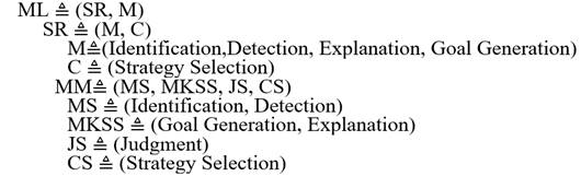 Self-regulation: this type of metacognition monitors and controls the reasoning process that takes place at the object-level. Self-regulation contains two stages, which are sets of meta-cognitive functions (MCF): Monitoring Stage (Identification MCF, Detection MCF, Explanation MCF, and Goal Generation MCF) and Control Stage (Strategy Selection MCF).