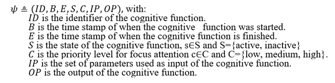 According to Caro, Gomez, and Giraldo [20], when the cognitive function () is executed at the object level with an input (IP), output (OP) and start time (B), a profile is automatically generated for the cognitive function in the self-model with the fields.