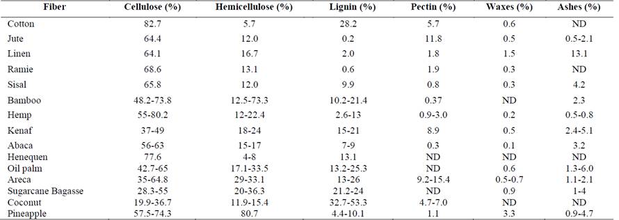 Table 1.: Chemical composition of different natural vegetable fibers.