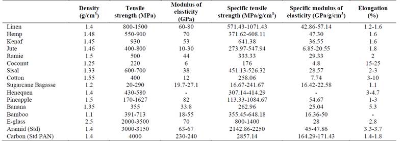 Cellulose imposes mechanical strength to the fibers (resistance and rigidity), lignin is the hydrophobic part, and hemicellulose, the most amorphous component, improves water absorption and mechanically facilitates elasticity. These vegetable fibers present highly dispersed mechanical properties and are dependent on their chemical composition and the conditions in which they are found, mainly of their degree of humidity, their cultivation processes, and extraction methods [10] However, Table 2 shows that the specific mechanical properties of these natural fibers are similar or even superior to those presented by synthetic fibers such as fiberglass [7,8,12]