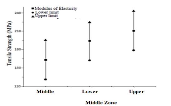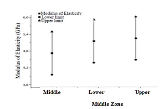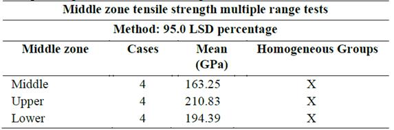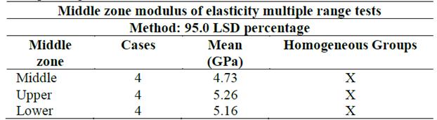 According to the statistical analysis made from the ANOVA table, it can be determined that the "middle zone" factor, divided into upper, middle, and lower, does not present a statistically significant difference in its mechanical properties (elastic modulus and tensile strength), since the F-ratio is very small (inter-group and intra-group quotient estimates) and the P-Value is greater than 0.05, as may be observed in Tables 4 and 5.