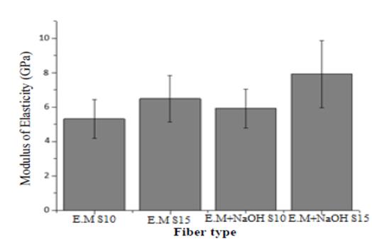 In term of calibration lengths, a better tensile strength is obtained when using a span of 10 mm, since there is a smaller number of defects and/or irregularities that can generate fractures in the fiber bundle. Otherwise, for the elastic modulus, the best result is reported when using a 15 mm span because there is a greater number of bonds aligned in the direction of the applied force, which plays an important role in this property.