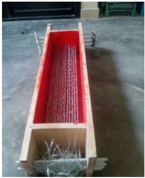 Figure 1: Wooden molds within aluminum accessories and PET-profiles matrix: 5 layers with 11 threads every layer.