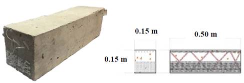 Once the concrete mixture is designed and tested. The concrete is casted in molds made off wood with cross-section 0.15 x 0.15 x 0.50 m. Every PET-thread had knots every 0.02 m to provide traction and an additional pre-tension was induced (approximately - 1 kg per thread). A cast beam-type specimen with the PET-profile matrix is shown in Fig. 3.