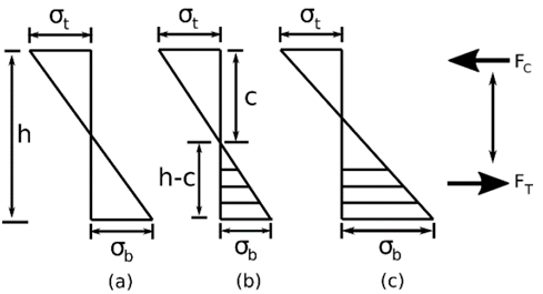 Eq. (1) is used to estimate the tension stress in the bottom fiber where rupture is taking place: