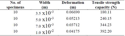 Table 1: Tensile strength capacity of PET-profiles with different widths and a length equal to 0.25 m and Thickness 4.5 x10-4 m