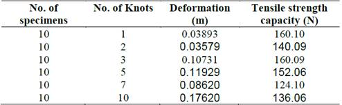 Table 2: Tensile strength capacity from knotted PET-profiles with a width 3.5 x10-3 m, length equal to 0.25 m and Thickness 4.5 x10-4 m
