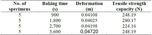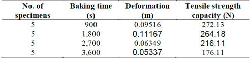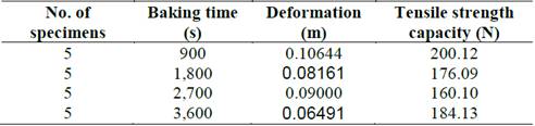 Table 3: Tensile strength capacity from PET-profiles baked at 50 °C with a width 3.5 x10-3 m, length equal to 0.25 m and Thickness 4.5 x10-4 m