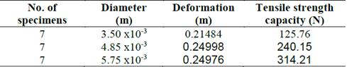 A considerable number of Tests were carried out with different diameters of extruded Plastic-profiles, see Table 6 where it is shown that the Plastic-profile of 5.75 x10-3 m in diameter has the highest tensile strength capacity.