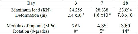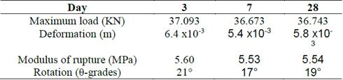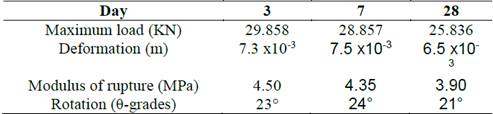 The average of the maximum load capacity and deformation are obtained from beam-type specimens casted at different ages; see Tables 7 to 9 where Fluctuated load capacity values are observed. The PET-profiles in a unidirectional and bidirectional matrix arrangement have influence in the flexural strength capacity of the beams-type specimens. In Tables 7 to 9, The deflection has also an considerable importance in the load capacity and modulus of rupture where a soft increment in the value are observed in beam-type specimens with PET-profiles settled in a uni and bi-directional matrix. It is because the beam-type specimens with PET-profiles can support more deflection. The influence of the PET-profiles is higher in the test specimens with a unidirectional arrangement than in a bidirectional matrix where the PET-profiles settled with a 45° angle could affect the behavior of the unidirectional PET-Profile arrangement which could work once the concrete have failed. In Tables 7 to 9, the rotation is estimated using the data of maximum load and deformation. It is easy to see that the PET-profiles provide a better rotation degree to the beam where, the beam-type specimens made with PET-profiles placed in a bidirectional fiber matrix placed to 45° have higher rotation and flexibility with similar flexural strength those beam-type specimens with a unidirectional fiber matrix.