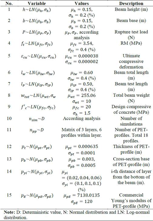 In this section, a probabilistic approach is proposed to evaluate PET-Contribution in terms of capacity and failure. In Table 10, the stochastic variables are enumerated. It is worth to mention that PET contribution affects more the vicinity of flexural failure stage when these profiles are delaying the Rupture modulus (RM) while the flexural beam upper compression block is increasing (or decreasing) to balance the flexural capacity. Therefore, the rupture modulus test considers an early state during beam behavior before tension-cracking condition where it is always expected a sudden and brittle beam failure.