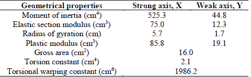 In accordance with the limit of width-to-thickness ratio of the flanges and the web and using the values of the mechanical properties shown in Table 2, the section is classified as compact since the width-to-thickness ratios of the elements are lower than the limit of maximum slenderness ratio for compact elements. The limits of width-to-thickness ratios were calculated using the requirements outline in ANSI/AISC 360 [21]. These values are summarized in Table 3.