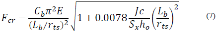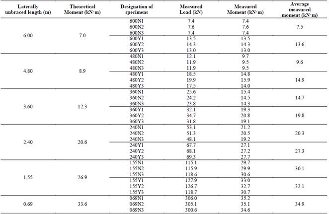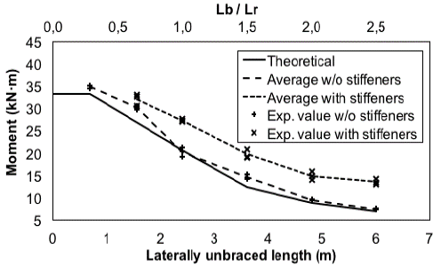 Specimens with laterally unbraced lengths of 2.40 through 6.00 m, increased their flexural capacity from 34 to 82%. These lengths correspond to an elastic buckling zone, as shown in Fig. 12, where lengths are expressed in terms of both laterally unbraced length and L b /L r ratio.