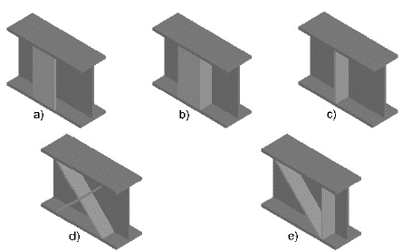 Figure 1: Type of stiffeners. a) Longitudinal stiffeners, b) Box stiffeners, c) Transversal stiffeners, d) Cross stiffeners, e) Diagonal stiffeners.