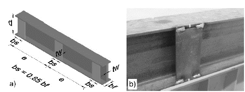 Based on the values above, the bending tests were performed using laterally unbraced lengths (L b ) of 0.69, 1.55, 2.40, 3.60, 4.80, and 6.00 m. For each test length, six specimens were considered. The six specimens included three with longitudinal stiffeners and three without stiffeners, except for the length of 0.69 m, which had no lateral displacement problems (plastic buckling zone). For this length, only three specimens with no longitudinal stiffeners were tested. Longitudinal stiffeners consisted of steel plates with widths b s = 62 mm, corresponding to 85% of the flange width (b f ) and a thickness equal to the thickness of the web of the section (t w ) as shown in Fig. 4a.