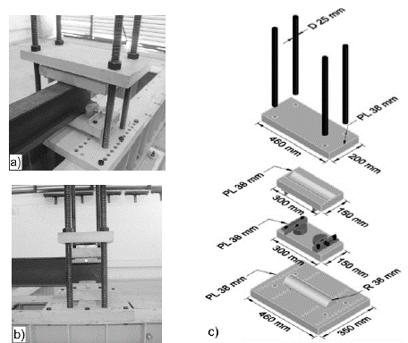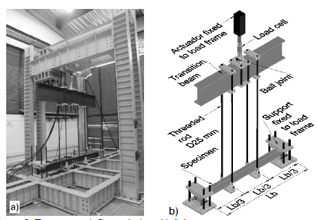 The vertical load was applied with 200 and 500 kN capacity hydraulic actuators located at a height of 3.4 m from the ground and fixed to the load frame. Each actuator was used depending on the expected load of failure of the specimen. The actuator was connected to a load cell with equal load capacity, and then connected to a transition steel beam (IPE 330) letting the load to be transferred as point loads at the central third of the beam, by means of high-strength threaded rods as shown in Fig. 5b.
