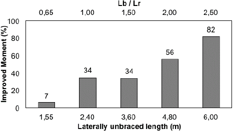 On the other hand, for the laterally unbraced length of 1.55 m (inelastic buckling zone), the achieved improvement in moment capacity was 7%, which does not represent a meaningful increase.