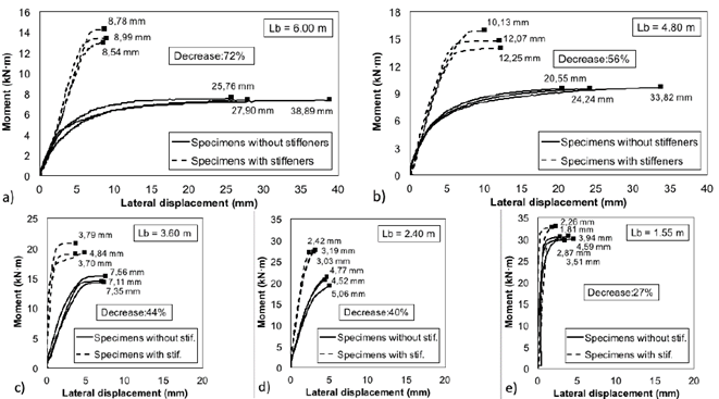 A similar behavior occurred for the laterally unbraced length of 4.80 m as shown in Fig. 13b. The average value of lateral displacement reached by the specimens without stiffeners (26.20 mm) decreased to an average value of 11.48 mm in the stiffened specimens, which represented a decrease of 56%. Therefore, the use of longitudinal stiffeners results in a noticeable lateral stability in the specimens for laterally unbraced lengths of 4.80 and 6.00 m.
